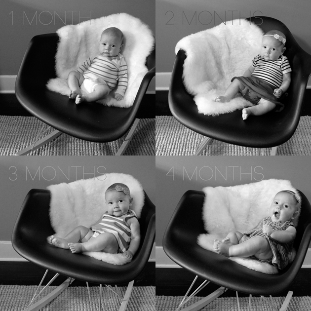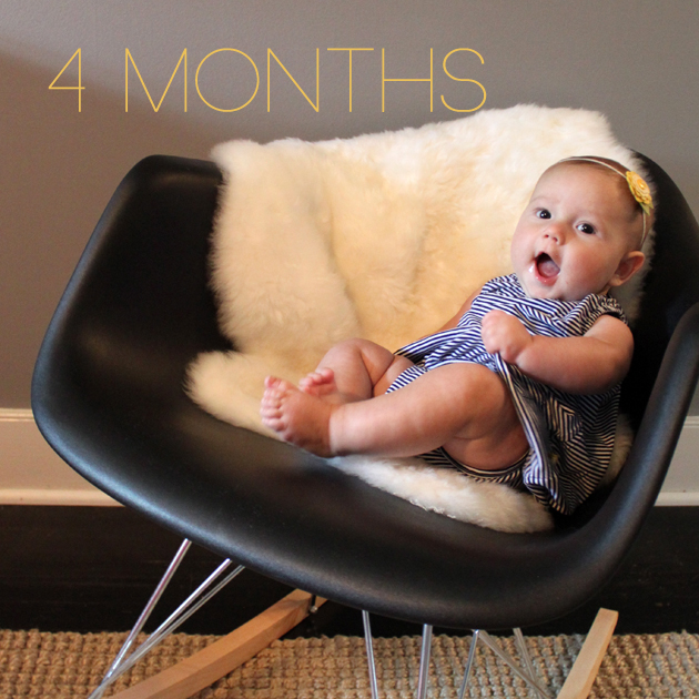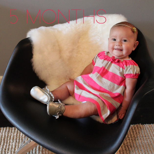 EATING: sweet potatoes and apples. so far so good. SLEEPING: through the night! i reintroduced the crib bumper and now our wiggle worm comfortably bounces around in the night and doesn’t make a peep. this makes for some well rested adults. MOVING: like a jumping bean in her favorite jumperoo. girl makes us sick to watch but absolutely loves the thing. and when we can’t contain her in it, she’s off and wiggling her way through the house. INTENT ON: brown dog. she’ll sit and follow calie around the room forever with a little smile on her face. she’s in love, and it’s a shame the dog could care less. PLAYING WITH: her giant bla bla kitty that’s been sitting on a shelf. the thing is twice her size and it looks silly to watch them play. TRYING TO FIGURE OUT: how to sit up. she’s trying her hardest to twist and prop herself up off her belly. LISTENING TO: her daddy sing. i haven’t heard it, but I hear she’s mesmerized and gives him a solid stare. i can only imagine why. i’m totally sneaking home early one night. TALKING ABOUT: girls got a case of the giggles. that’s right, a whole lot of them! little chica’s bff auntie chris won the first squeal and she’s been making noise ever since. i must admit it’s the sweetest sound ever.